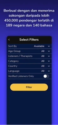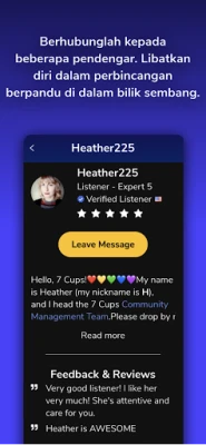 Dengan jaringan lebih 450,000 pendengar terlatih dan ahli terapi berlesen di seluruh dunia, 7 Piala menawarkan pelbagai sokongan yang komprehensif. Pendengar kami terdiri daripada sukarelawan yang ikhlas ingin membantu, masing-masing dengan profil dan kepakaran khusus dalam pelbagai isu seperti panik, buli, gangguan makan, atau perpisahan. Anda boleh berbual 1-1 secara rahsia, memilih pendengar baharu setiap kali atau membina hubungan berterusan dengan seorang yang anda percayai. Selain itu, platform ini turut menyediakan pilihan terapi mesej dalam talian bersama ahli terapi berlesen, serta ratusan latihan kesedaran percuma untuk menenangkan minda anda, ujian kesihatan peribadi, dan video pendek yang membimbing anda menuju pertumbuhan diri. Kerahsiaan anda adalah keutamaan, memastikan identiti anda sentiasa dilindungi.