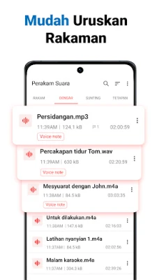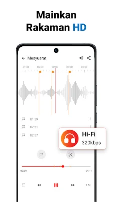 Di luar rakaman semata-mata, Perakam Suara - Perakam Suara VI berfungsi sebagai pusat penyuntingan audio yang berkuasa. Tandakan momen penting dalam rakaman anda dengan penanda, tambah tag untuk pengkategorian mudah, dan laraskan kelantangan atau kadar bit (sehingga 320 kb/s) mengikut keperluan. Main semula audio menjadi lebih interaktif dengan pemain media terbina dalam yang mesra pengguna, membolehkan anda mempercepat atau memperlahankan kelajuan, serta menyokong rakaman stereo dan mono. Dengan editor audio bersepadu, anda boleh memotong, memangkas, atau menggabungkan segmen audio dengan mudah, menjadikan proses pasca-rakaman lebih efisien. Sempurnakan dan kongsi rakaman anda dengan komuniti anda melalui pelbagai platform media sosial atau e-mel, menjadikan setiap suara anda didengari.