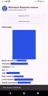 Dapatkan gambaran menyeluruh tentang data pengenalan, termasuk nama penuh, nombor pengenalan diri (CNP), jantina, kewarganegaraan, tarikh dan tempat lahir, serta alamat kediaman. Maklumat dokumen seperti nombor, tarikh pengeluaran, dan tarikh luput turut dipaparkan dengan jelas. Jika tersedia pada cip, foto pemilik juga akan dipaparkan untuk pengesahan visual. Untuk kemudahan pengurusan dan rujukan masa depan, anda boleh menyimpan semua data ini dalam format PDF, termasuk alamat kediaman, untuk pengarkiban atau perkongsian yang mudah atas inisiatif anda sendiri. Proses imbasan berulang juga dipermudahkan dengan fungsi semakan pantas, menjimatkan masa anda.