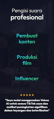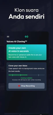 Bagi pencipta kandungan, Voices AI adalah aset yang tidak ternilai. Ubah projek video, segmen siaran, iklan, atau apa jua inisiatif multimedia anda dengan sulih suara berkualiti industri tanpa perlu mengeluarkan kos tinggi seperti perkhidmatan tradisional. Lebih revolusioner lagi, Voices AI memperkenalkan keupayaan klon suara inovatif. Ciptakan replika suara anda sendiri atau suara lain dengan hanya sampel audio pendek, membuka pintu kepada dunia personalisasi. Gunakan suara klon ini untuk narasi peribadi, gurauan, atau eksperimen kreatif, menjadikan setiap teks pengalaman pendengaran yang benar-benar unik dan diperibadikan.